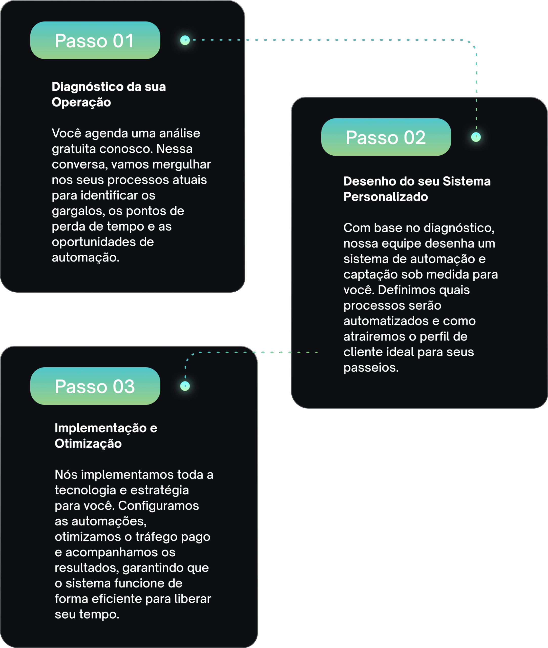 Com base no diagnóstico, nossa equipe desenha um sistema de automação e captação sob medida para você. Definimos quais processos serão automatizados e como atrairemos o perfil de cliente ideal para seus passeios.